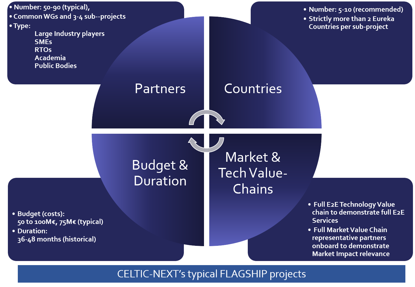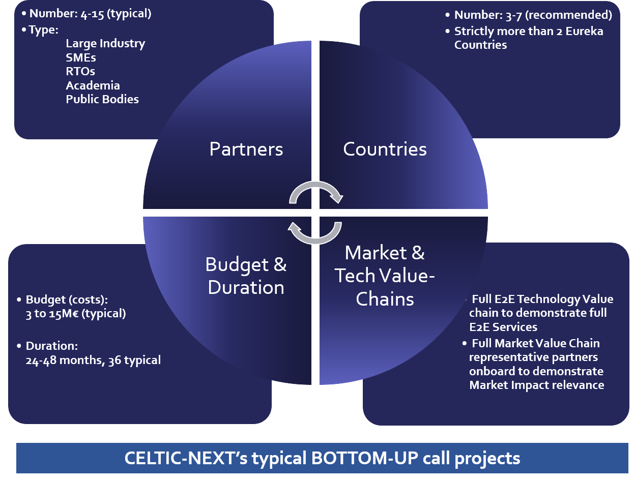 There are 3 types of CELTIC-NEXT calls: bottom-up calls, flagships and ECP (Eureka Clusters Programme) Thematic Calls